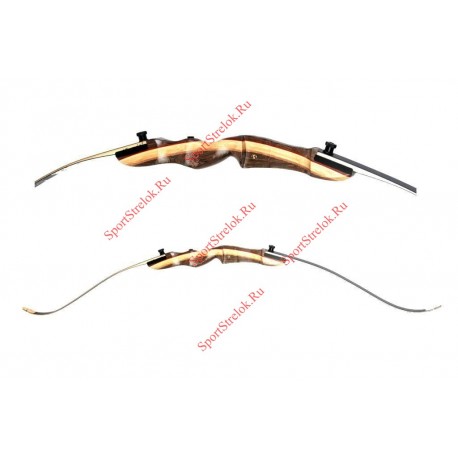 Рукоять лука изготовлена из дерева, имеется крепление для установки плунжера и стабилизатора. Плечи изготовлены из качественного стекловолокна покрытого прозрачным ламинатом, сердцевина плеч сделана из клена. Лук подойдет для начинающих стрелков и может послужить прекрасным подарком. Данная модель является разборной, что облегчает транспортировку лука.
